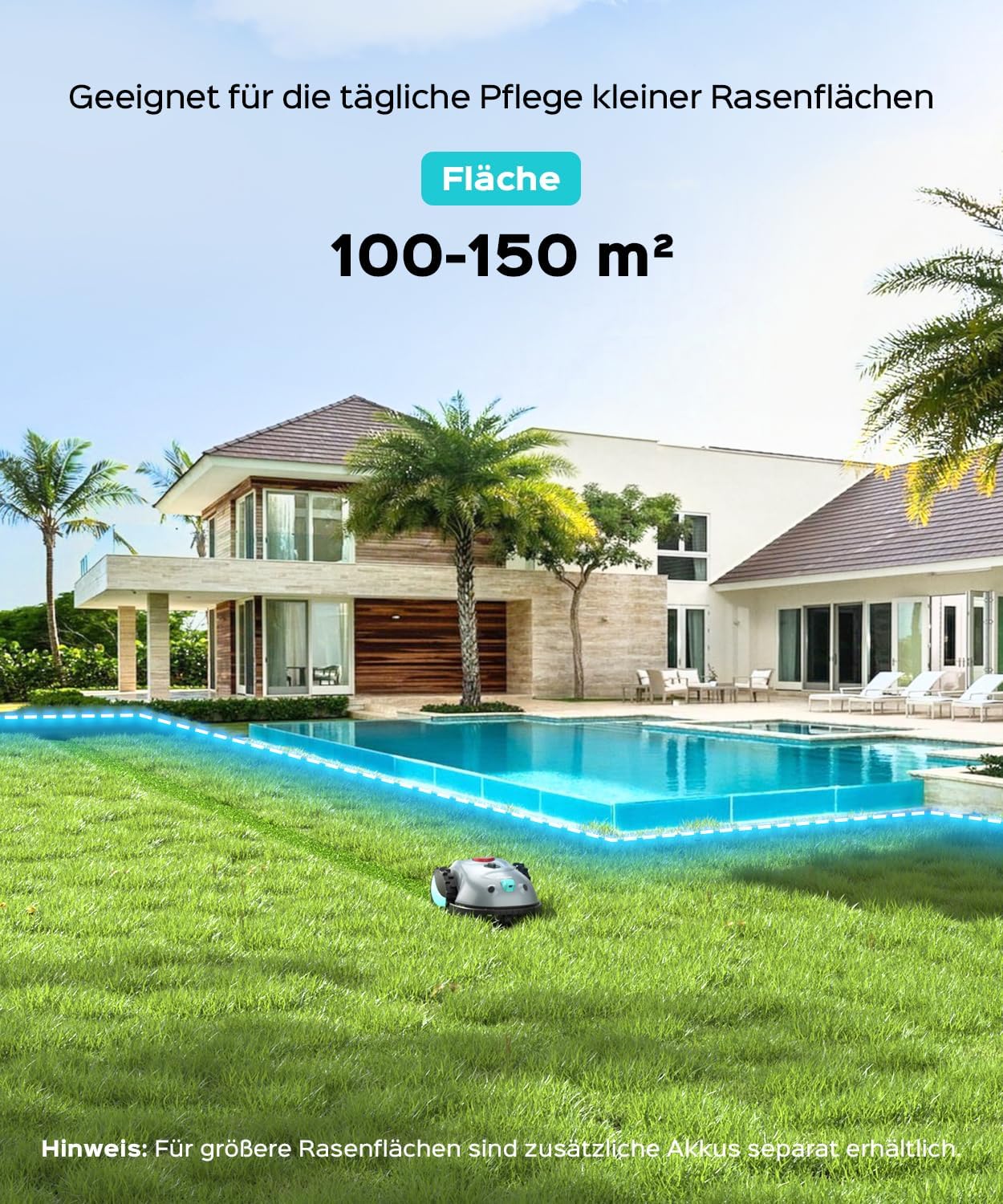 V100 Mähroboter ohne Begrenzungskabel (150 m²) – Vision-Navigation & KI-Hinderniserkennung | Inkl. Graskamm & Ersatzklingen