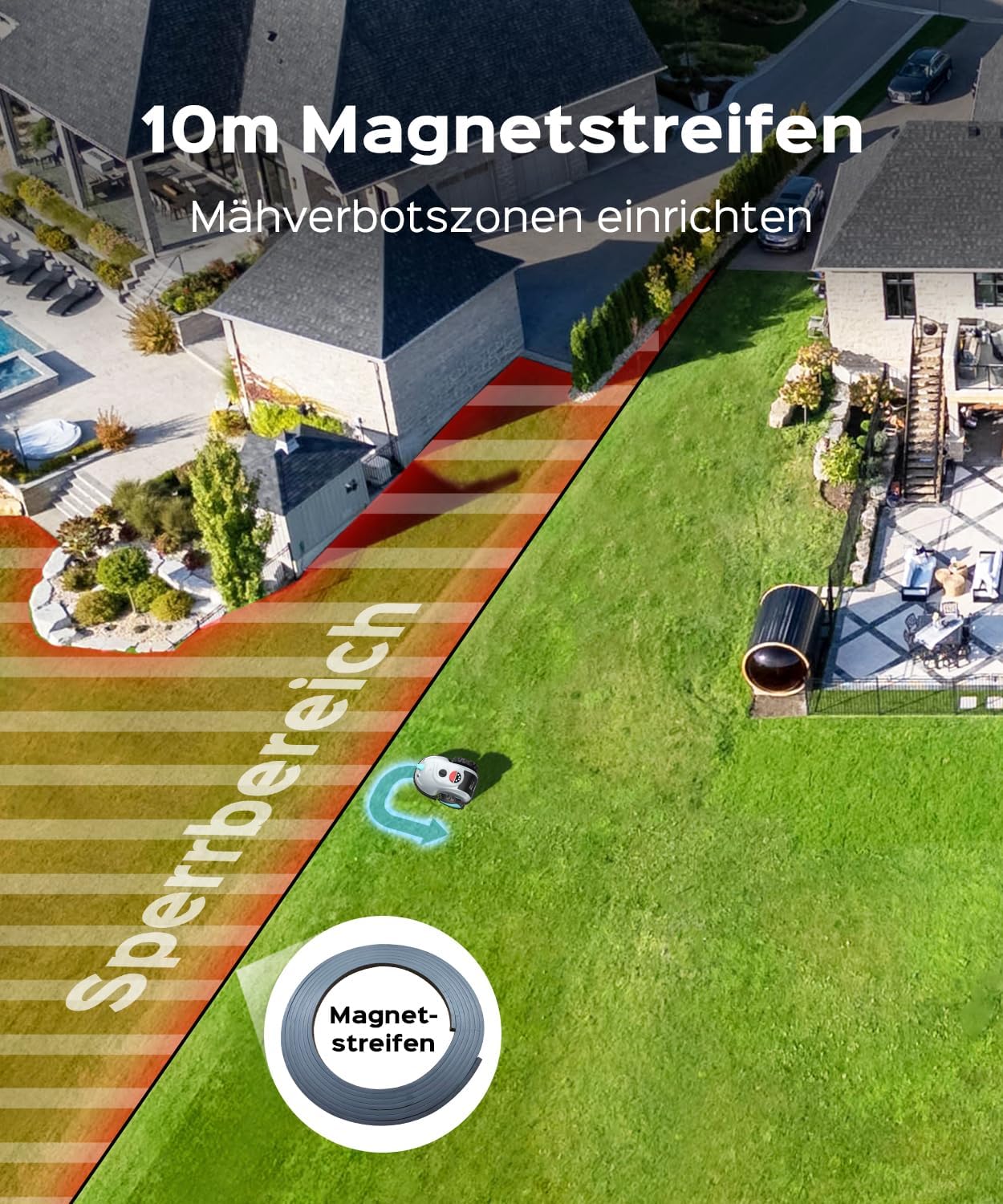 Präzise Kamera-Navigation & Hinderniserkennung Die integrierte Vision-Technologie erkennt bis zu 150 verschiedene Hindernistypen in Echtzeit. Für komplexe Gartenbereiche oder unklare Rasengrenzen bietet das mitgelieferte Magnetband zusätzliche Sicherheit und eine exakte Abgrenzung.