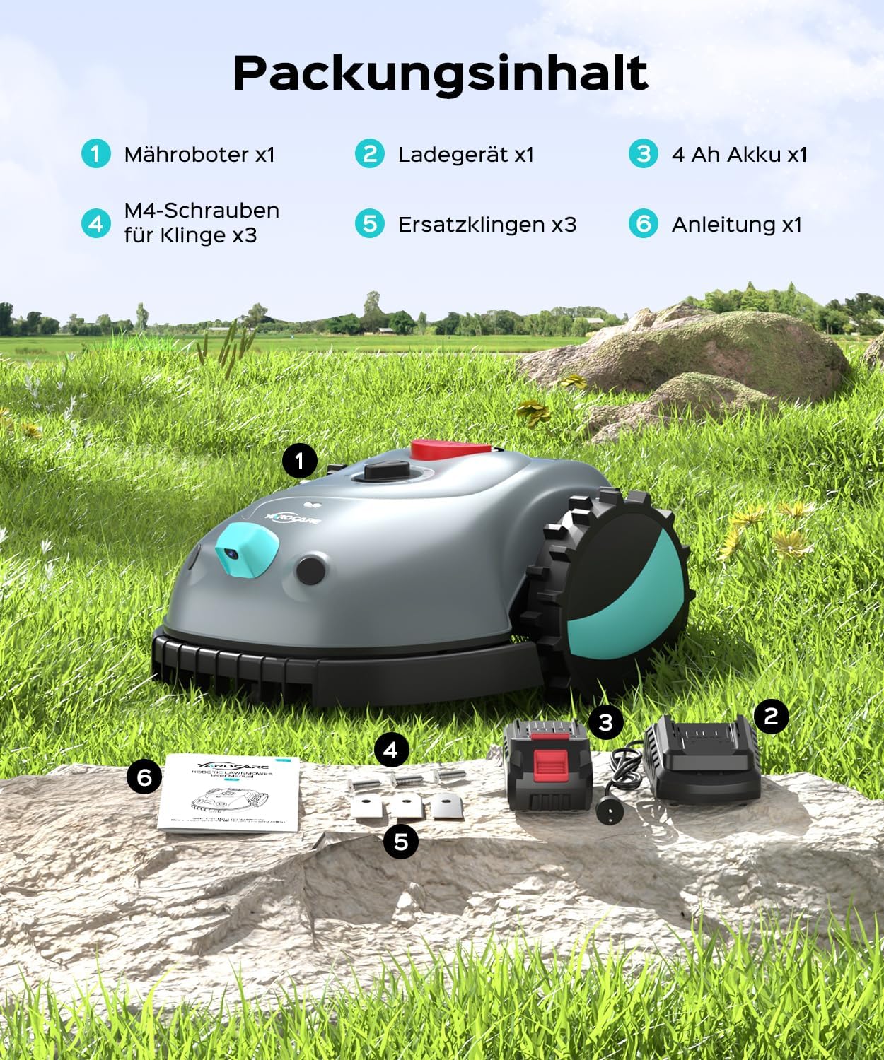 V100 Mähroboter ohne Begrenzungskabel (150 m²) – KI-Kamera & Vision-Navigation, 4Ah Akku, Spiralschnitt-Modus inkl. Ersatzklingen